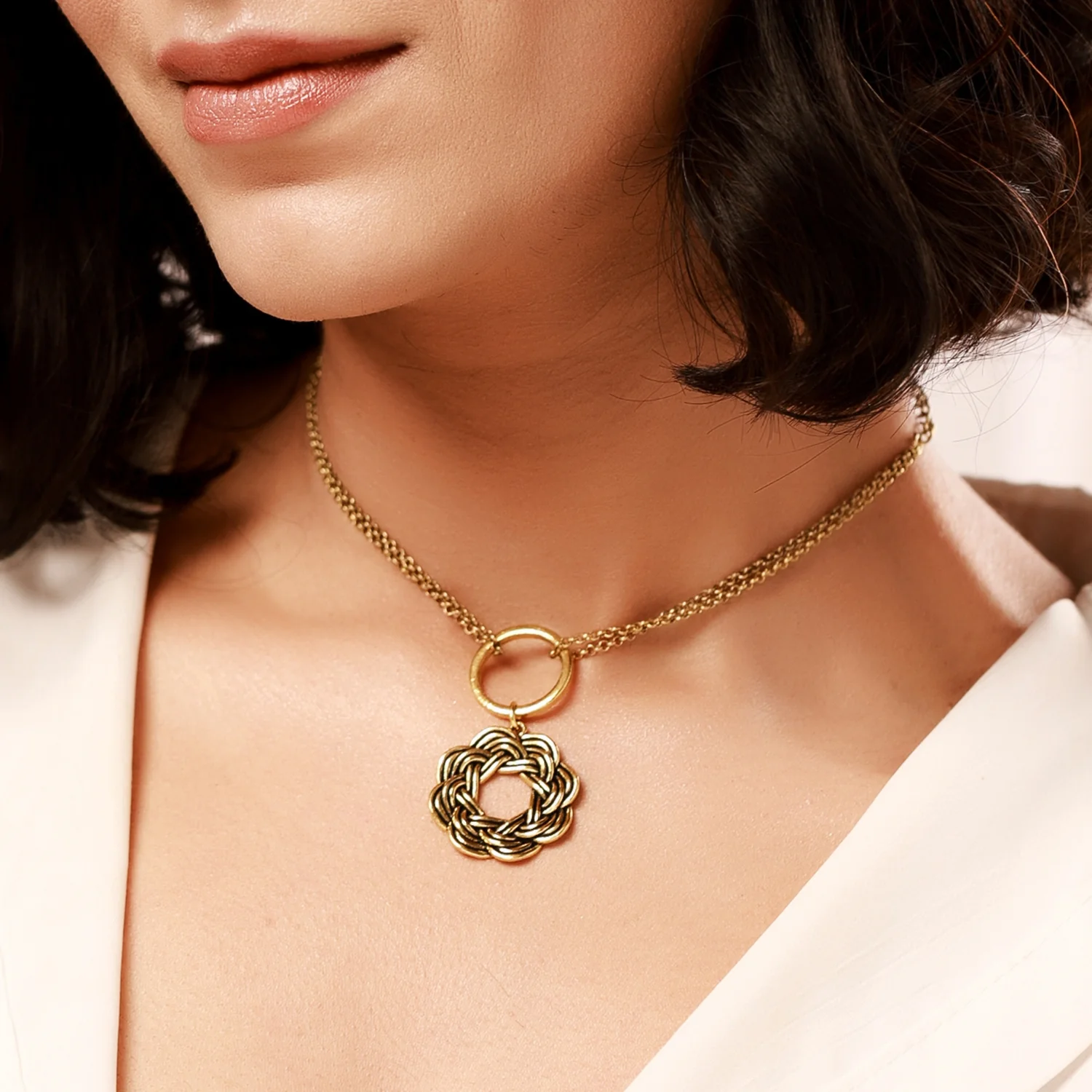 Dive into the elegance of the Woven Wonder Intertwist Choker Necklace, a masterpiece that seamlessly merges art with craftsmanship. Crafted from top-notch brass, this necklace boasts a luxurious gold oxidised finish that adds a touch of vintage charm to its modern design. The intricate woven pattern is inspired by the timeless craft of basket weaving, where each intertwining strand tells a story of meticulous artistry and dedication. Perfect for everyday wear, whether you’re dressing up for the office, heading out on a vacation, or making a statement at a special event, this necklace effortlessly elevates any outfit. The warm gold hue is not just about elegance; it’s about making you feel unique and sophisticated. It’s the perfect gift for any woman, be it a sister, girlfriend, wife, mother, or friend. Whether it’s Valentine’s Day, Diwali, Rakshabandhan, Christmas, New Year, or just a spontaneous gesture of love, this piece is sure to be cherished. Enrich your jewelry collection with a necklace that’s not just an accessory, but a celebration of beauty, craftsmanship, and the spirit of gifting.