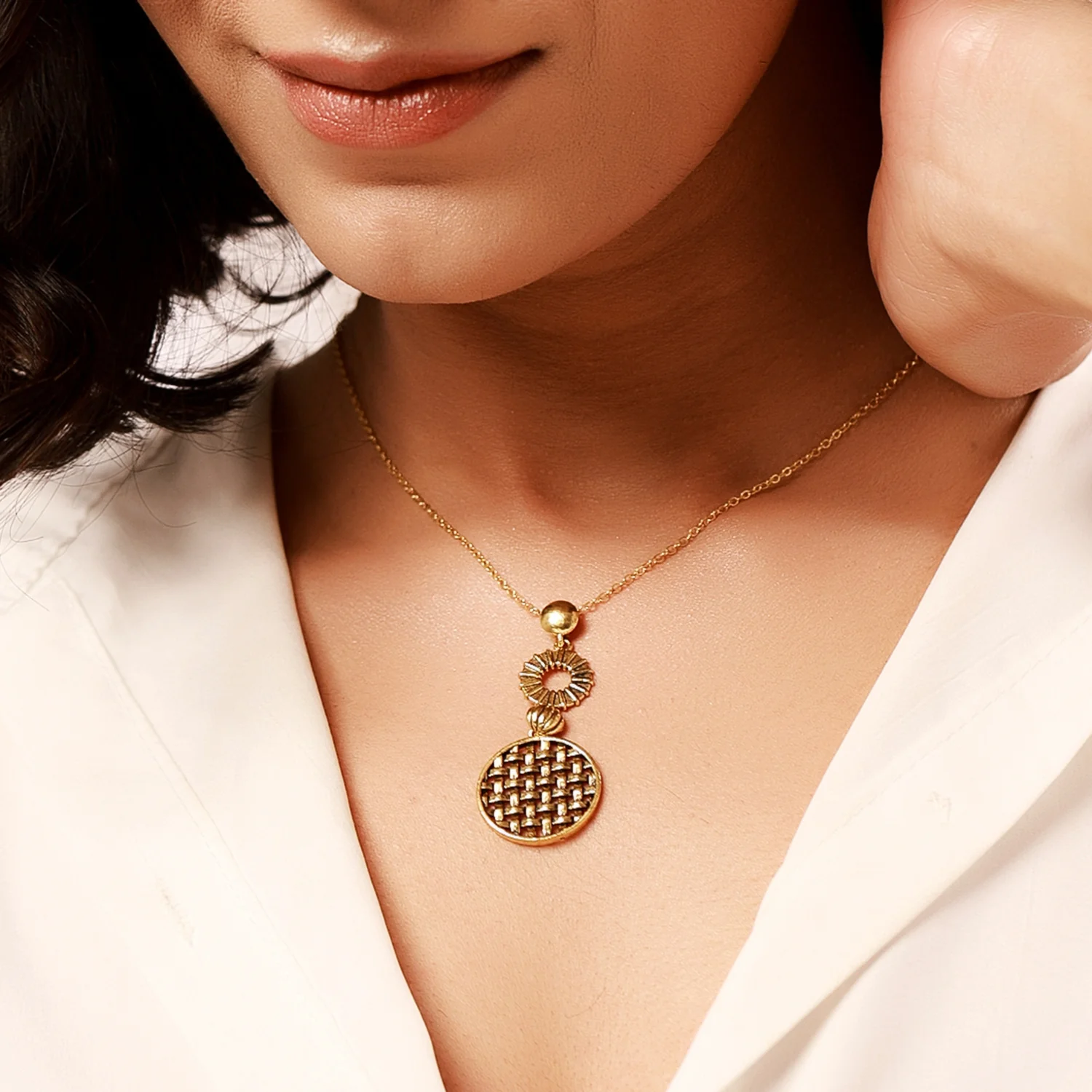 Introducing the Woven Wonder Plain Weaving Pendant, a stunning masterpiece from our Woven Wonder collection. This pendant showcases a meticulous design inspired by traditional basket weaving, embodying the essence of craftsmanship and heritage. Encased in a circular gold oxidized brass frame, the pendant features an intricately detailed woven pattern that exudes both elegance and sophistication. The pendant is suspended from a delicate gold-plated chain, adding a touch of refined charm to your neckline. Perfect for everyday wear, this boho-chic pendant effortlessly elevates casual and office attire, making it a versatile addition to any jewelry collection. The warm, gold oxidized finish adds a timeless appeal, making it an ideal gift for women on various occasions such as Valentine’s Day, Diwali, Rakshabandhan, Christmas, and New Year. Whether you’re looking for a thoughtful gift for your sister, girlfriend, wife, mother, or a special treat for yourself, this pendant is sure to impress with its timeless beauty and exceptional craftsmanship. Embrace the elegance of woven artistry and make a statement with this exquisite pendant.