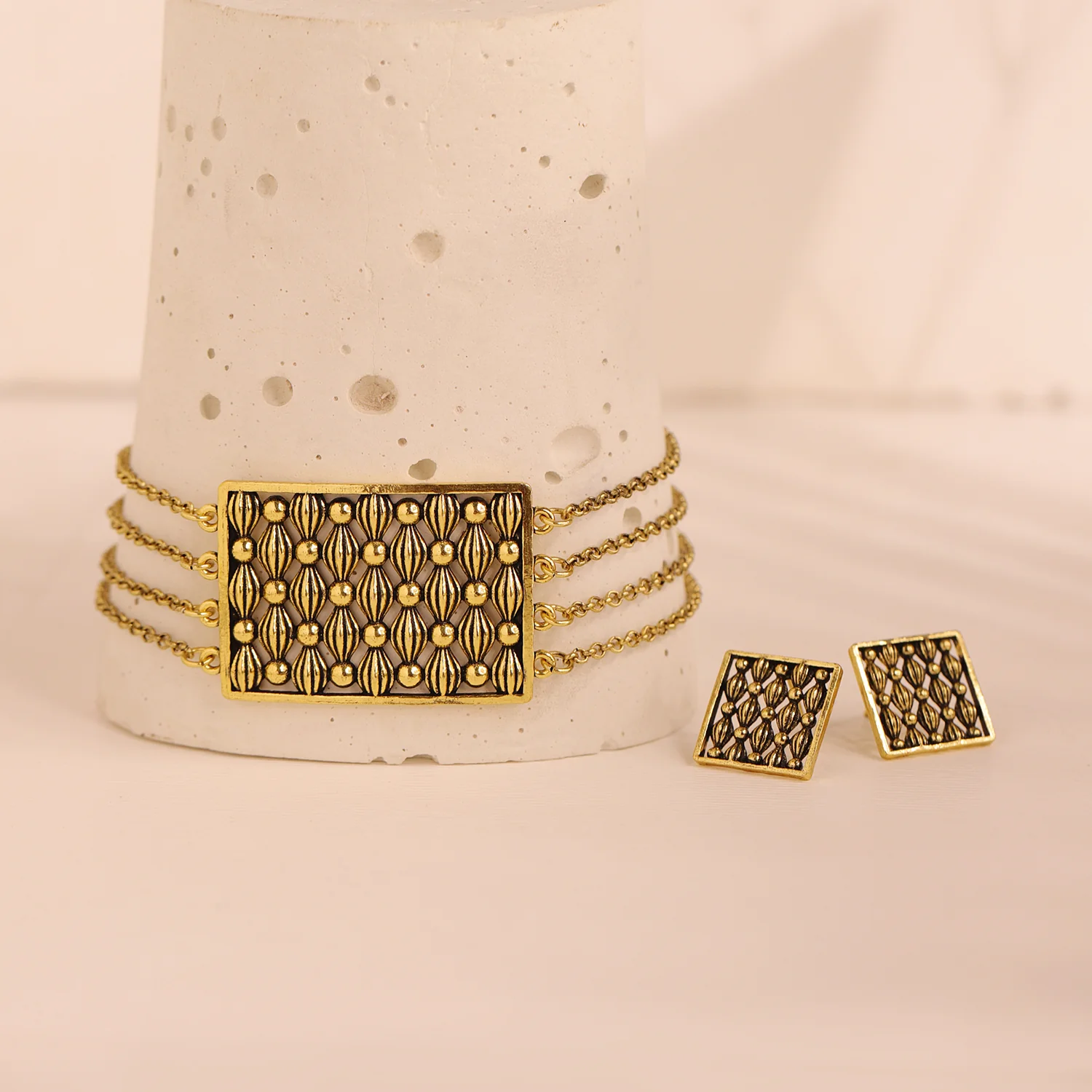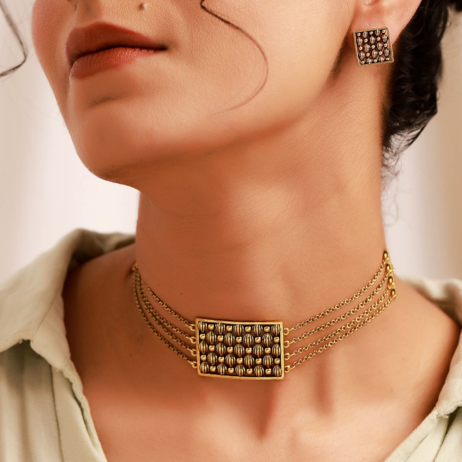 Dive into a world of elegance and craftsmanship with the Woven Wonder Wavy Weave Choker Necklace Set. This exquisite set includes a beautifully designed choker necklace and matching earrings, meticulously crafted from high-quality brass and finished with an enchanting gold oxidized plating. The intricate wavy weave pattern is inspired by the traditional art of basket weaving, adding a boho-chic touch that stands out in any ensemble. Perfect for everyday wear, vacation, or special occasions like Diwali, Rakshabandhan, and Valentine’s Day, this set makes an ideal gift for women, including sisters, girlfriends, wives, mothers, and friends. The versatile gold oxidized color complements a variety of styles, from casual office looks to sophisticated evening wear. Elevate your accessory game with this statement necklace set that effortlessly blends traditional craftsmanship with modern aesthetics.